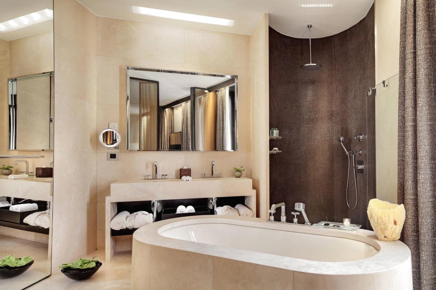 Deluxe, Guest room, 1 King. Overlooking the garden or courtyard, this large room features walk-in closets. The bathroom, with a black granite bath and a Navona Travertine shower, has floor-to-ceiling windows facing either the garden or a typical Milanese court yard. This room cannot accommodate extra beds. ;